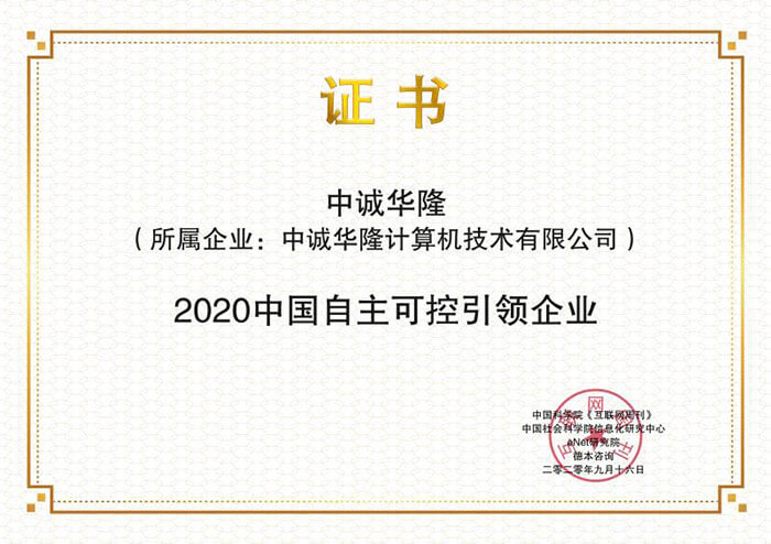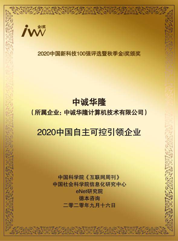 2020年9月16日,由中国科学院等主办的2020中国新科技100强评选暨秋季i金奖颁奖典礼在北京盛大举行,中诚华隆荣获 “2020中国自主可控引领企业” 。