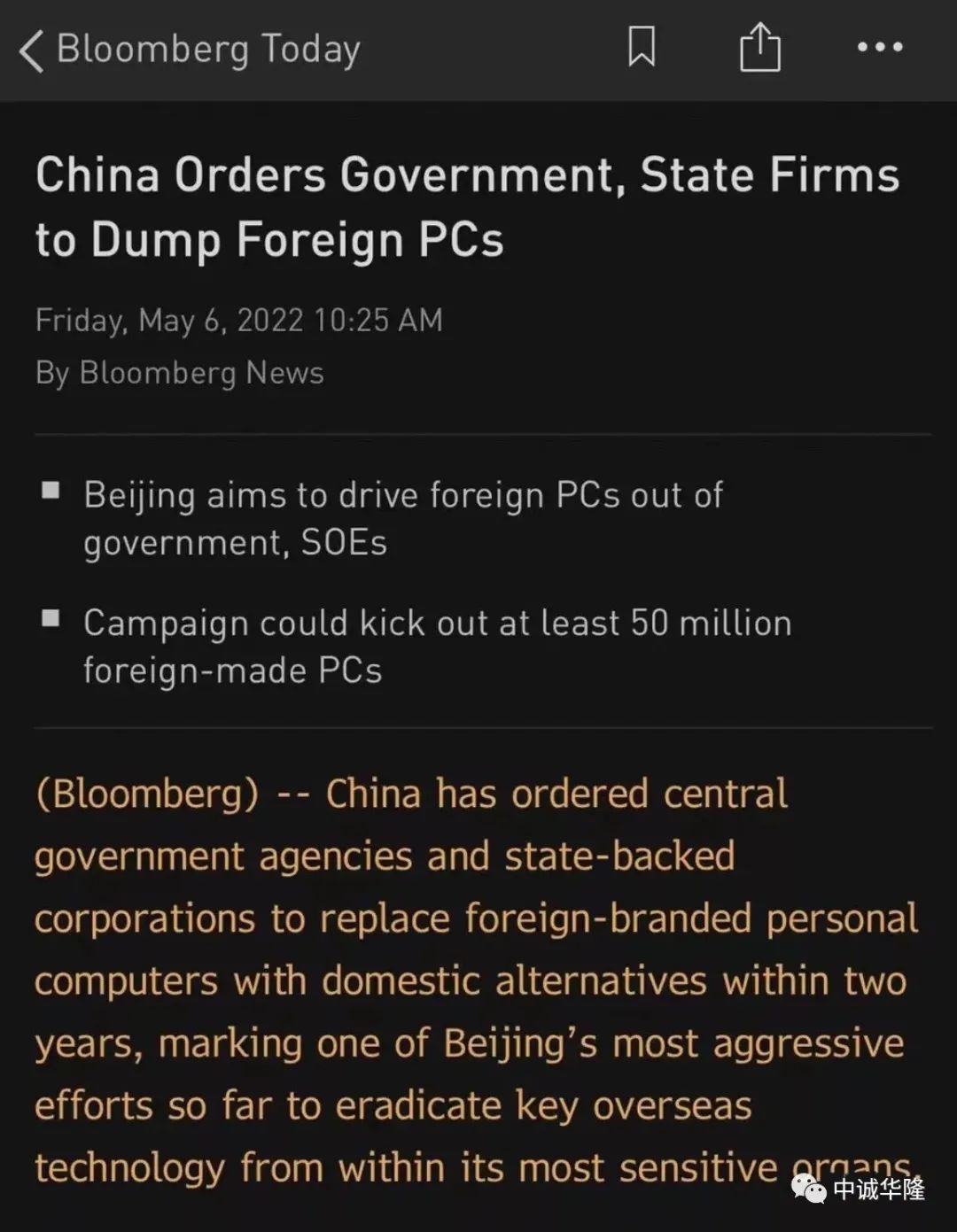 据彭博社报道,我国中央政府及央企层面可能至少有5000万台PC必须按照要求进行更换,更换为搭载本土开发的操作系统的国产PC,不久还将扩展至省级政府,预计两年内完成。