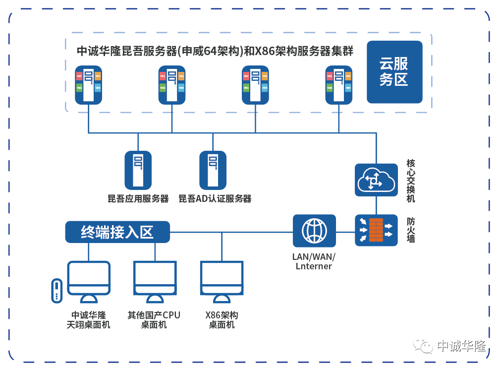 中诚华隆基于搭载国产电子办公云桌面系统,通过与行业合作伙伴的协同创新研制了“跨平台、跨系统兼容” 电子办公云桌面解决方案,构建后端异构(昆吾服务器系列与X86服务器、ARM服务器兼容)/同构(昆吾服务器系列)和终端异构(天翊桌面机系列与X86服务器、ARM桌面机兼容)/同构(天翊桌面机系列)的云桌面服务,客户可以利用天翊桌面机系列连接到云端的云桌面服务资源,即可访问自己的桌面,操作体验上与使用本地PC终端完全保持一致。