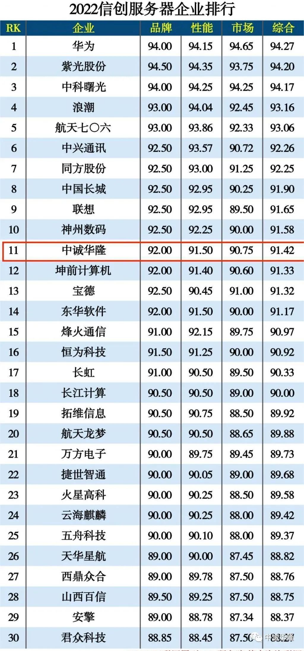 中诚华隆从信创底层硬件赋能出发,凭借出色的综合实力及对信息技术应用创新的坚持,荣登“2022信创服务器企业排行榜”第11位。