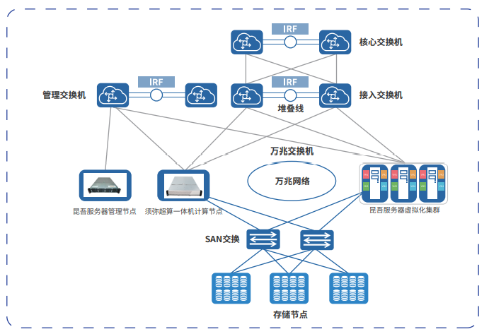 中诚华隆通过自研可控的须弥超算一体机产品,为解决复杂的科学计算或数值计算问题提供了更高性能计算硬件平台,满足了用户对高性能计算、专业的应用程序等服务的要求,该产品基于申威众核异构:CPU、GPU混合设计,其双精度浮点性能可达3.168TPlops。为了更好的满足客户应用性能的需求,在高性能计算部分主要采用多个超算一体机计算节点组成,并部署管理节点方便管理和使用,计算网络方面通过超算一体机计算节点上联至两台万兆交换机来实现超算一体机到核心网络的数据高速转发和互联,满足计算节点冗余可靠的要求。另外存储方面根据客户需求采用中诚华隆吉量存储产品,为系统应用提供更高IO带宽的需求。