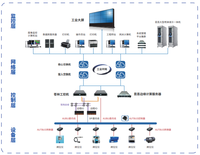 监控层通用以太网可以与控制层的工业以太网交换数据,上下网段采用相同协议自由通信,对设备层采集的数据进行管理和维护。