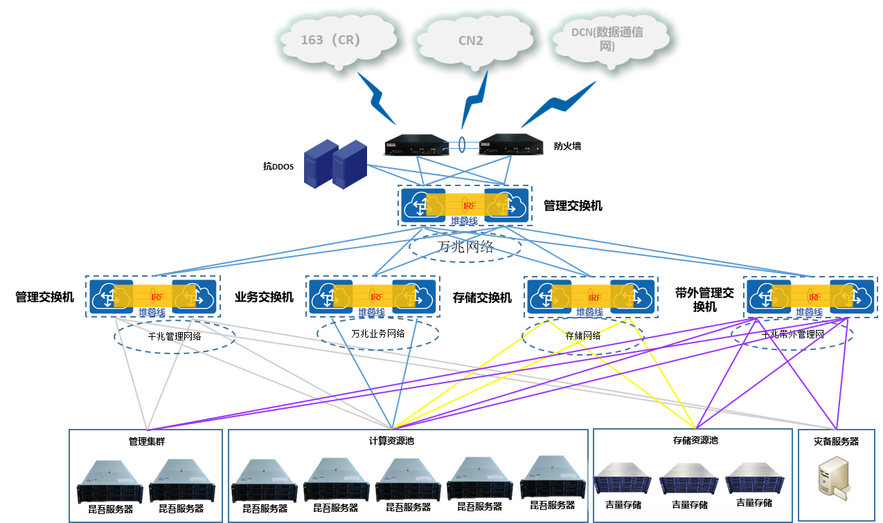 中诚华隆基于昆吾服务器、超算一体机产品搭建运营商云平台解决方案,此方案通过采用云平台技术架构部署,充分利用主机计算能力、网络和存储资源,为用户提供IaaS层云计算服务。通过双管理节点实现云平台的高可用性。利用高性能服务器组建云计算资源池,为应用系统提供弹性云主机服务。使用存储型服务器组建分布式块存储和对象存储服务,为应用系统提供安全、弹性、丰富的存储服务。用云平台备份功能来实现云主机及云盘的资源备份,保障业务数据安全性。网络设备方面全部采用双机冗余模式,保障云平台的网络无单点故障。云平台部署方式灵活且功能丰富,能够满足运营商对自主可信化、弹性伸缩、多租户场景等多重需求的高标准建设,资源利用率高,且易运维管理。