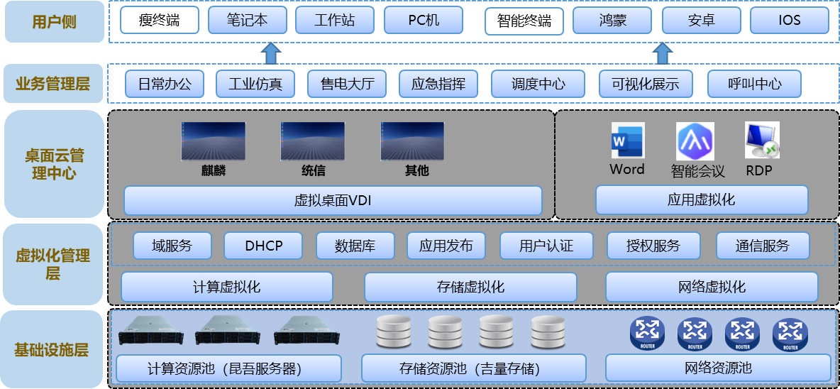 中诚华隆基于昆吾服务器、吉量存储设备等基础设施产品打造电力集团桌面云解决方案,该桌面云平台解决方案整体架构采用了基础硬件设施层、虚拟化管理层、桌面云管理中心和业务管理层架构思路。