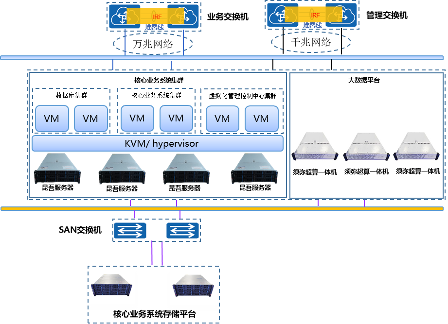 因涉及到核心业务数据和应用平台必须具有较高的稳定性和可靠性,确保在不影响生产经营和正常办公情况下,完成计算、存储资源扩容配置工作,实现将扩容的服务器与存储和SAN交换机统一部署,组成计算存储资源池,并纳入现有服务器虚拟化管理平台,对资源进行统一分配和管理,确保不间断稳定运行。