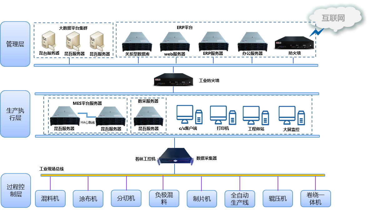 中诚华隆基于昆吾服务器等产品搭建新能源汽车锂电池生产管理系统解决方案,并根据新能源汽车产业实际的制造问题,结合新一代的信息技术实现整体系统规划,系统规划设计采用智能工厂工业软件平台实现新能源汽车锂电池生产管理系统的建设。通过采用实时历史数据库及控制管理软件实现车间设备互联互通,构建统一的数据交换服务,用于将生产现场的设备情况、质量检验的实时数据订阅及历史数据归档,供大数据平台进行数据分析,解决生产过程中的痛点。采用综合可视化软件的人机可视化界面全面掌握生产车间现场的实时作业情况,实现移动终端远程设备监控。生产执行制造MES系统采用信息集成门户平台搭建业务基础平台及建模,结合离散业MES插件构件整个生产环节,实现人机料法环的全面管理。
